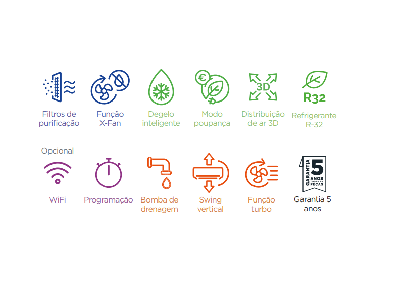 - O baixo nível de ruído e os ângulos das lâminas específicas para os modos de de refrigeração e aquecimento melhoram o conforto.
