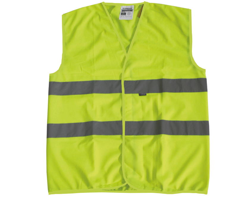 Colete de alta visibilidade fluorescente com abertura frontal ajustável com banda de velcro e com duas fitas refletoras horizontais que contornam o colete.